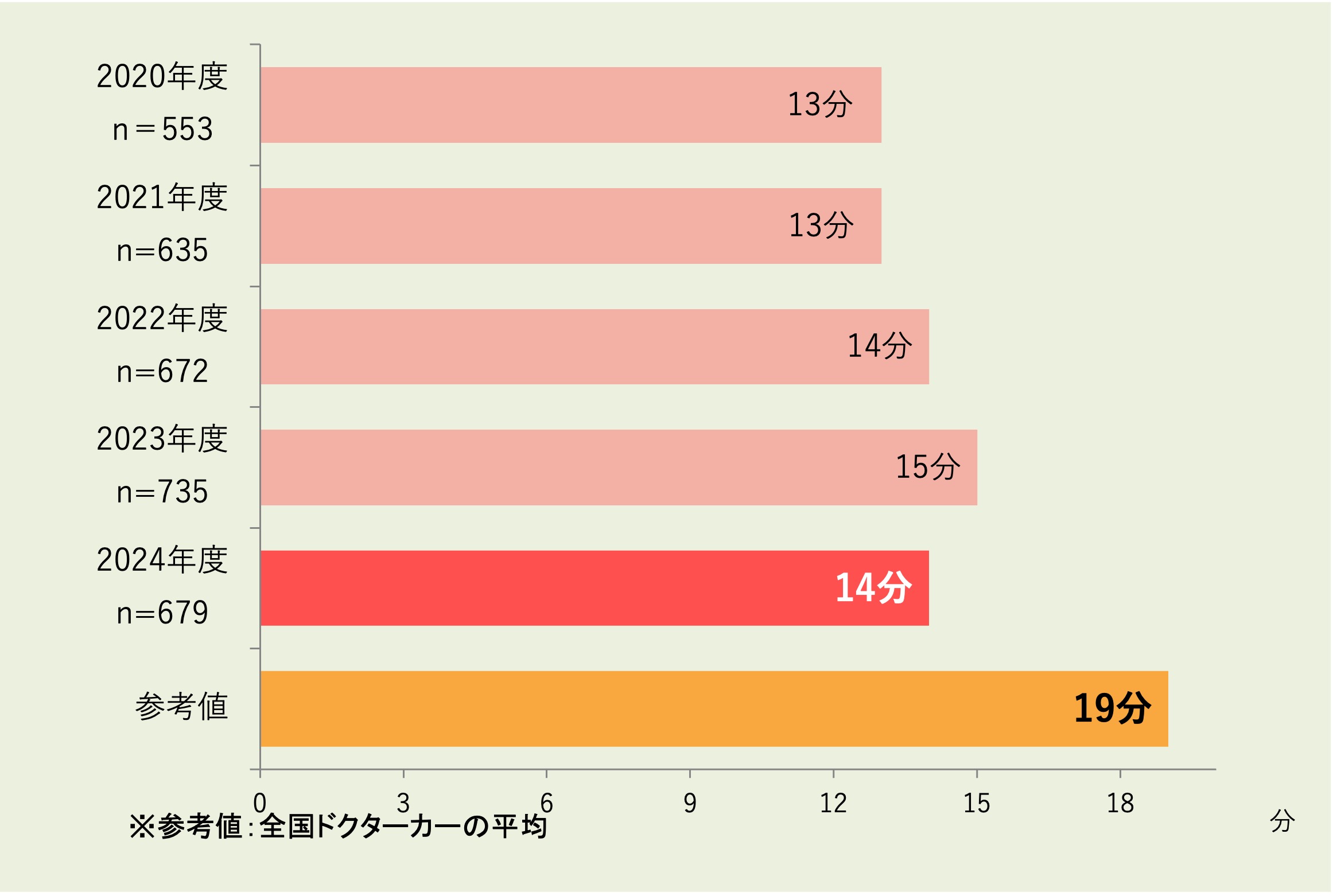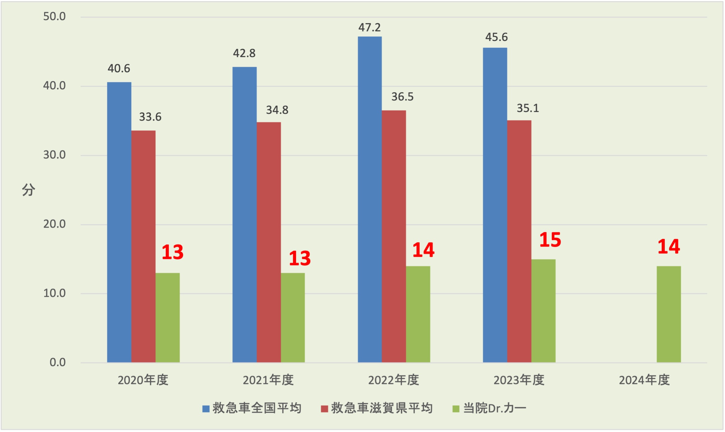 2024年度のドクターカー要請の「119番通報からドクターカーで患者接触までに要した時間」は14分でした。全国平均の19分より早い時間となっています。