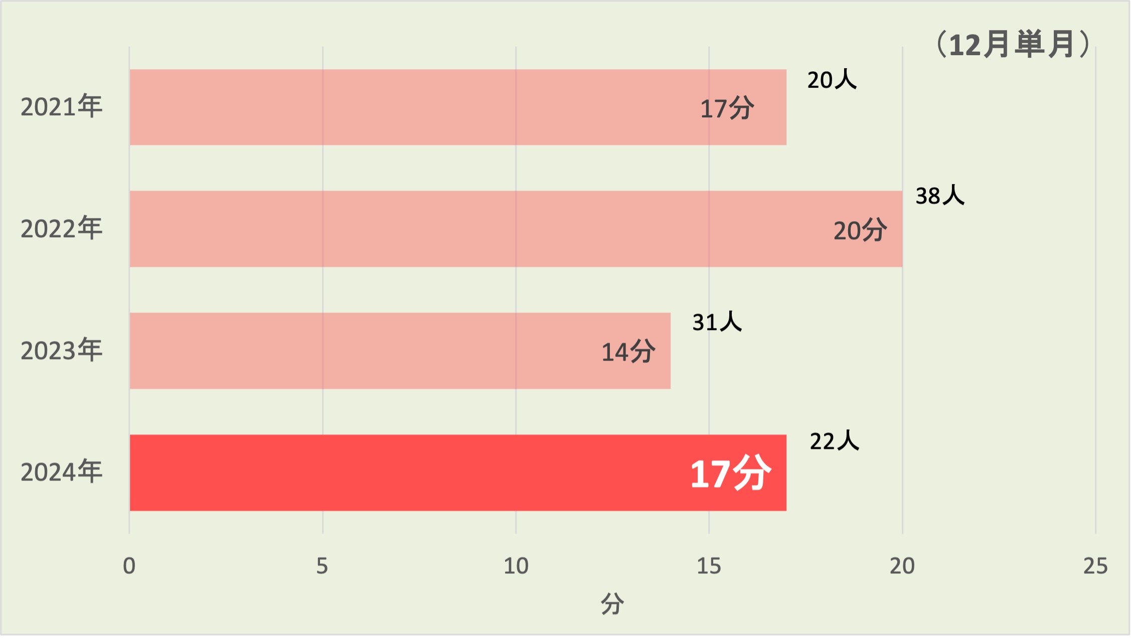 2024年の救急車搬入時間からCT検査施行までの時間(中央値)は17分でした。直近4年は、約20分でCTを施行できており、ドクターカーやドクターヘリが出動した事例では、10分以下の症例もありました。