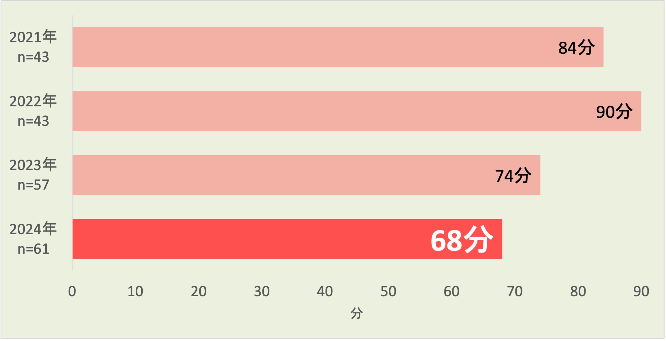 当院の2024年の経皮的脳血栓回収術を実施した患者さんの来院から治療開始までの時間は68分(中央値)でした。 2023年8月に発表された経皮経管的脳血栓回収用機器適正使用指針(第5版)では、来院から動脈を穿刺するまでの時間を75分以内の実施が合理的な目標とされています。当院ではこの目標値の75分以内で実施できていることが分かりました。