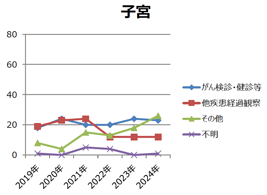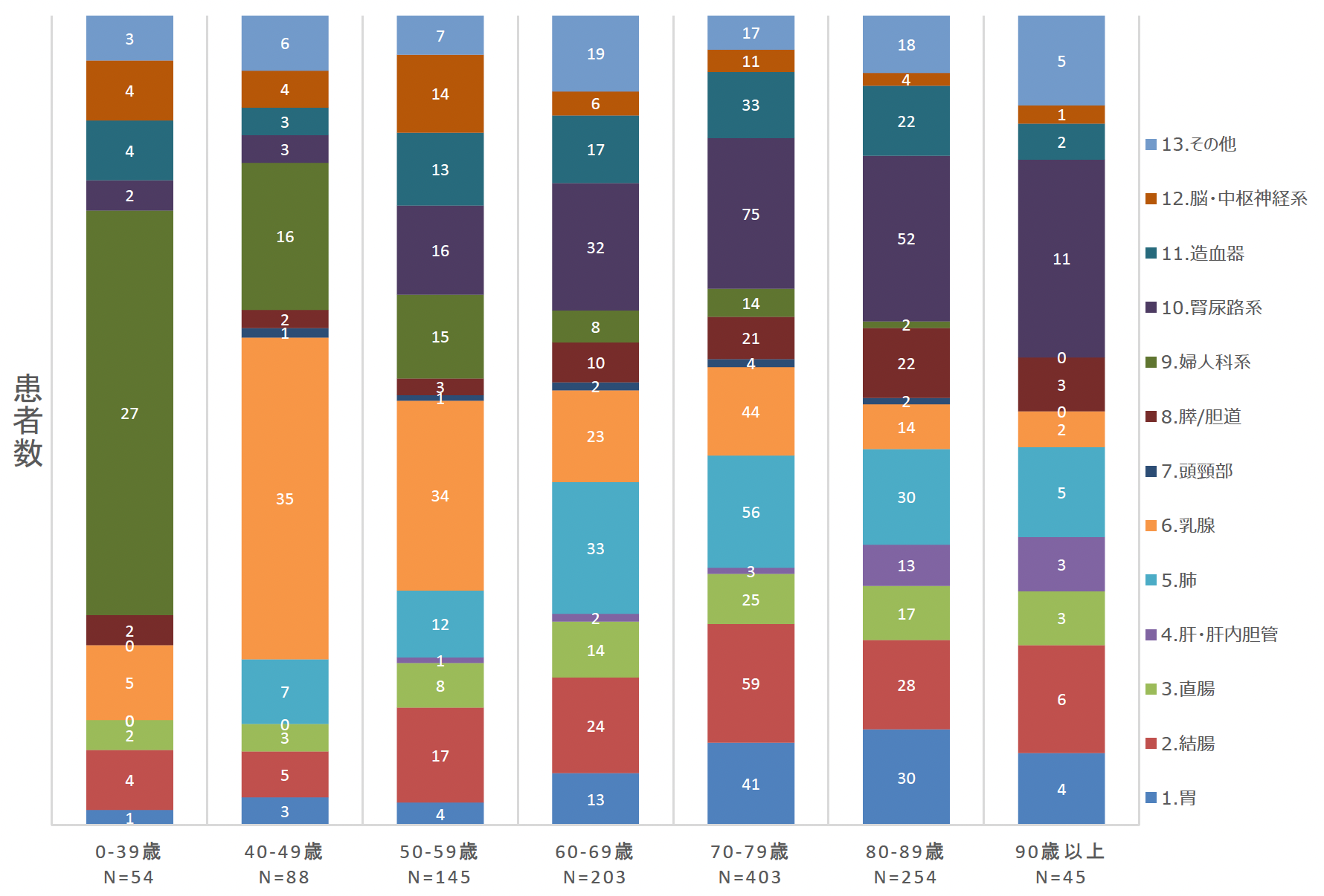 ほとんどの部位で件数が多くなっている「その他」は、がんによる自覚症状があった場合に分類される項目です。大部分の方が 何らかの症状がありがんが発見されたことを意味しています。