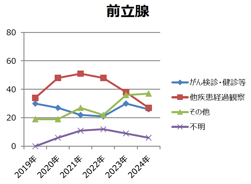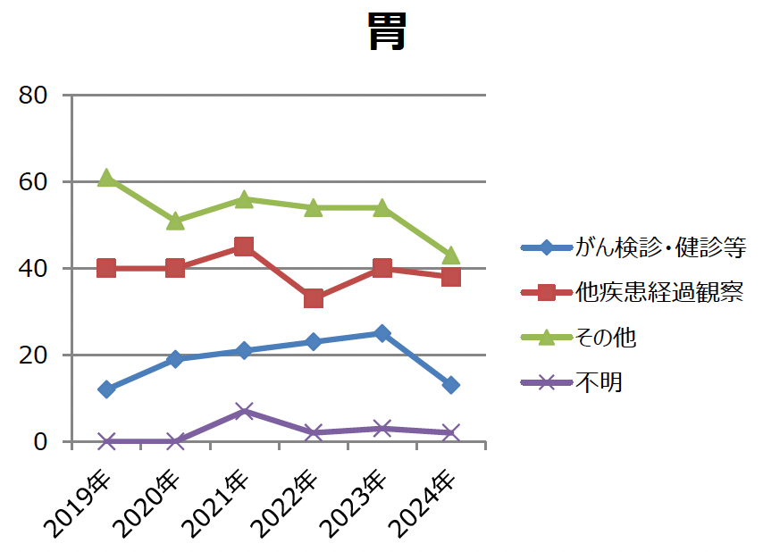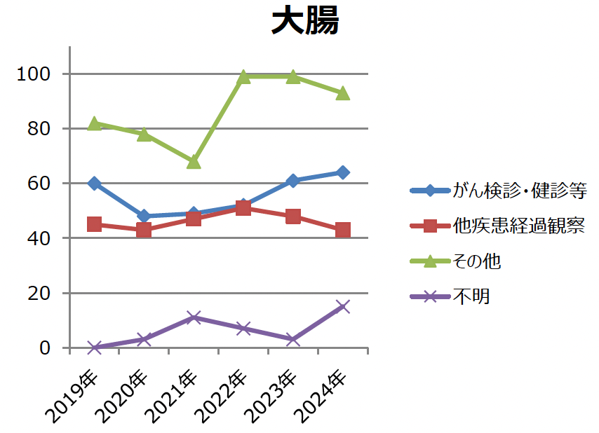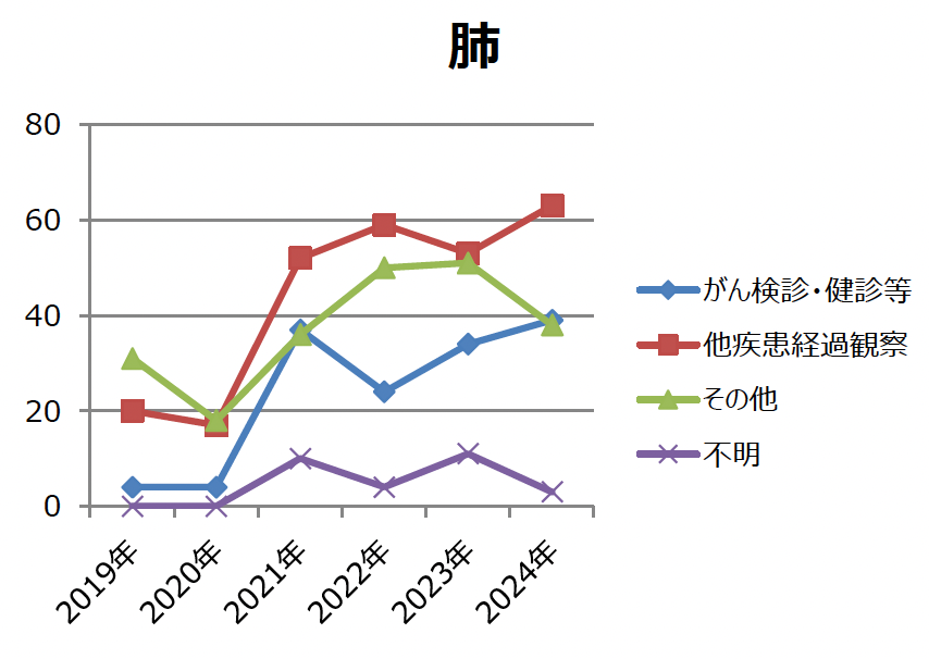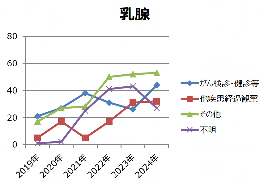 一方で、がん検診や健康診断などでがんが発見され、当院へ受診・治療を行った方は大腸・肺・乳腺で多く、特に肺や乳腺は増加傾向にあります。